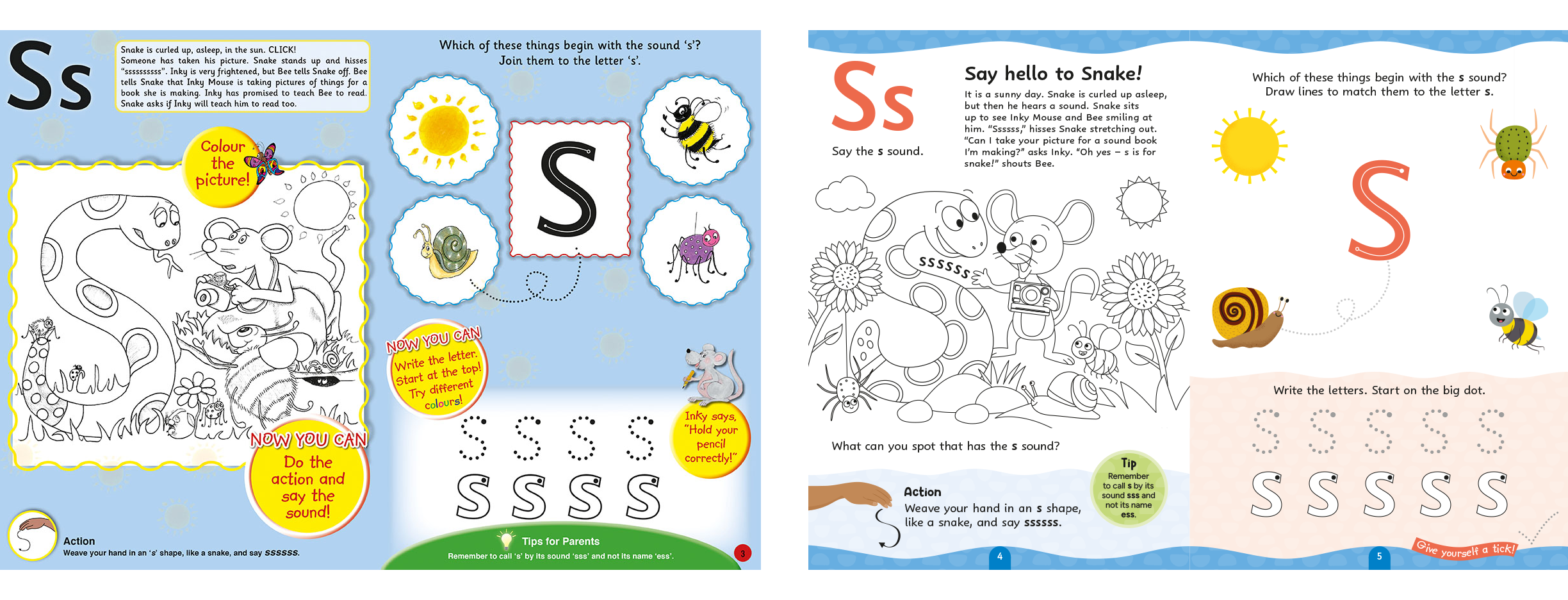 Planning helps an editor become immersed in a project. During planning for this series, the GMC editors developed new ideas for activities, stickers and writing practices that could be used across all seven books. These ideas formed the basis for page layouts, once approved by Jolly Learning. Once the first two detailed book plans were approved, the remaining five followed quickly. The GMC editors also carefully reviewed the existing text for potential updates and tweaks, making changes as necessary. Being a phonics series, it was crucial that we did this in close conjunction with the Jolly Learning authors and editors, so we kept to their protocols and editorial house style.